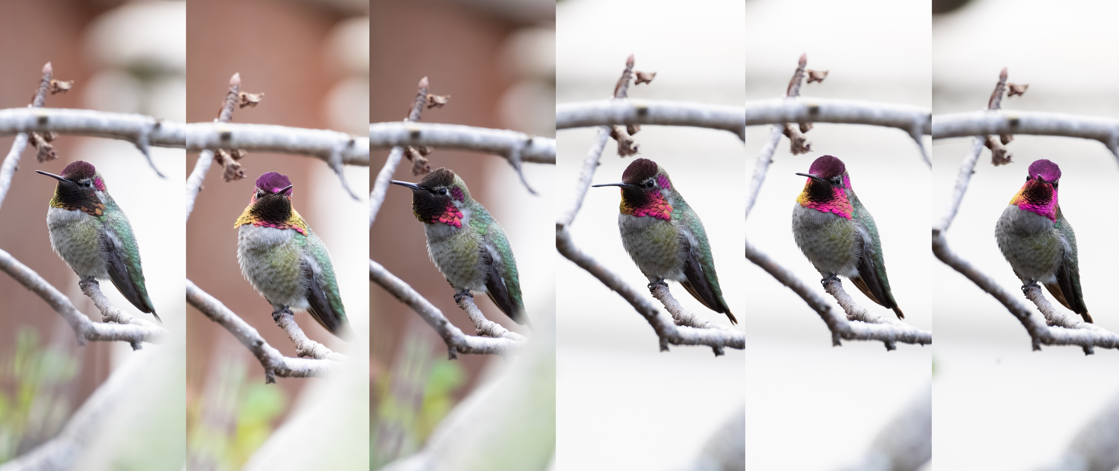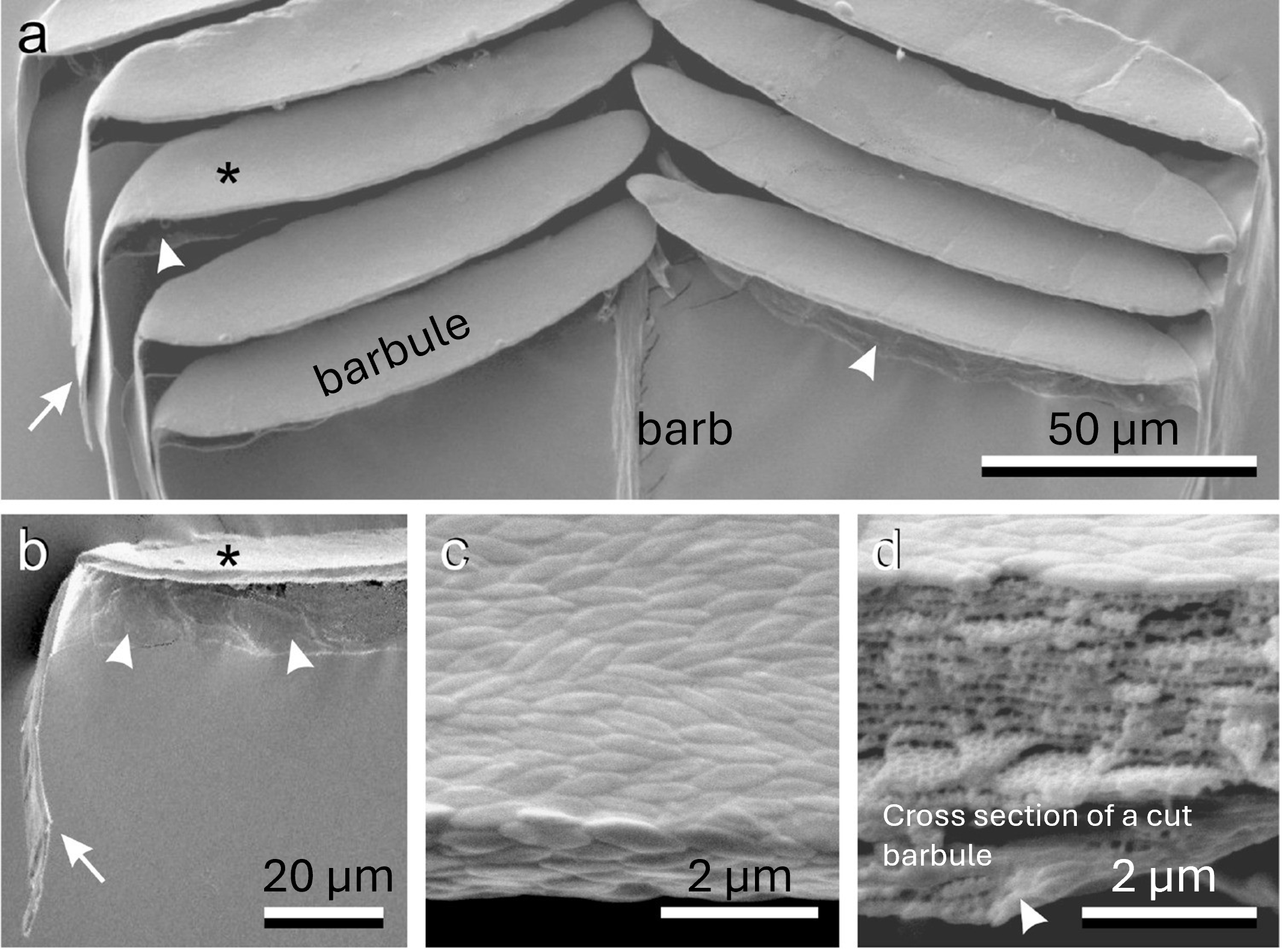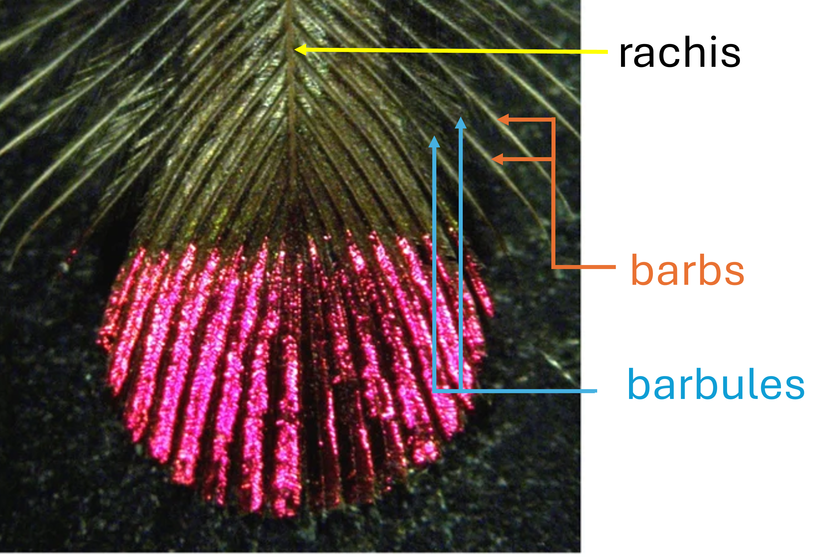 This absorb-and-reflect mechanism explains a large number of colors we see in our everyday lives. However, the light-matter interaction is more complicated than absorption and reflection. They also transmit, scatter, interfere, diffract, etc. Therefore, even without the presence of pigment, one might still see color display through other mechanisms from light-matter interactions. In the context of hummingbird's red neck, light interference is the main reason of this stunning color change. To make the interference happen, hummingbirds developed very unique microstructures in their neck feathers. I unfortunately was not able to get a sample of their neck feather, but found a nice research article revealing this secret in detail. Check the figures below and read the text underneath from left right to understand the structure of the feathers with length scales getting smaller and smaller. All three figures in the panel below are adopted from J Comp Physiol A 204, 965–975 (2018).